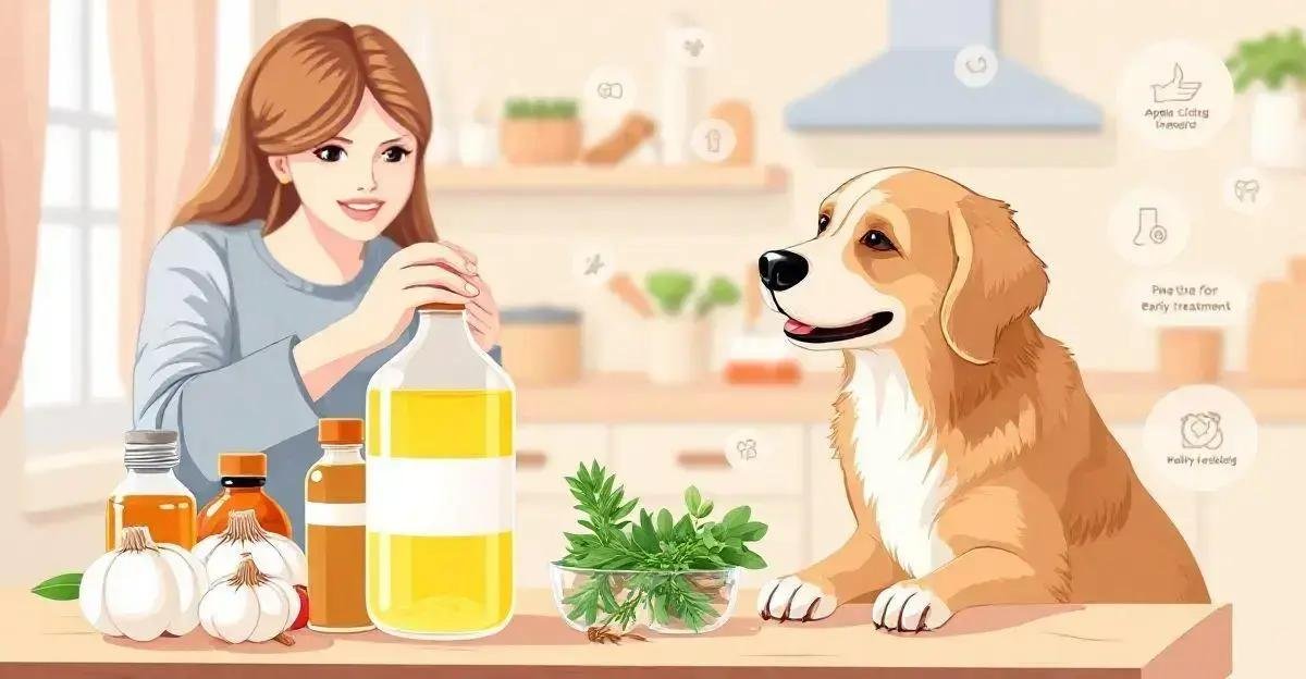 Alguns remédios caseiros incluem infusões de ervas, banhos de vinagre de maçã, pasta de alho e suco de limão, mas sempre consulte um veterinário antes de usar.